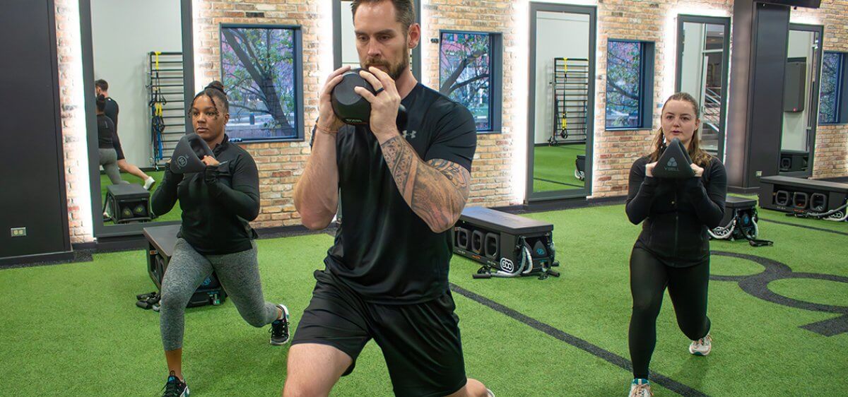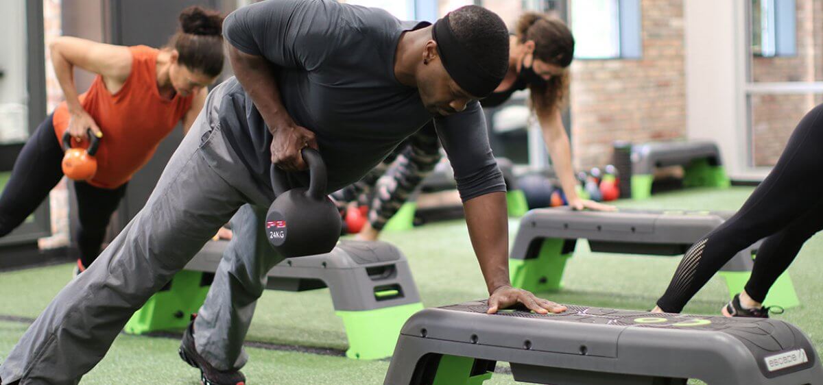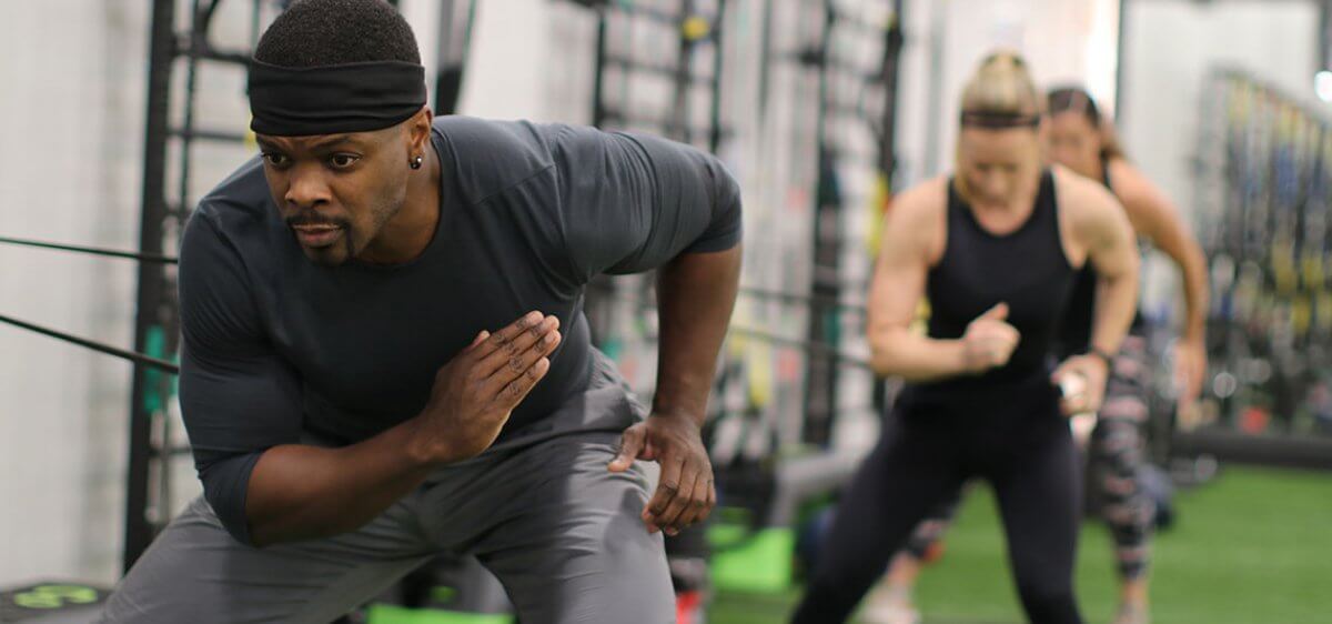 • A complimentary group workout with flexible start times. A new group begins every 10 minutes, so you can join when it works best for you.